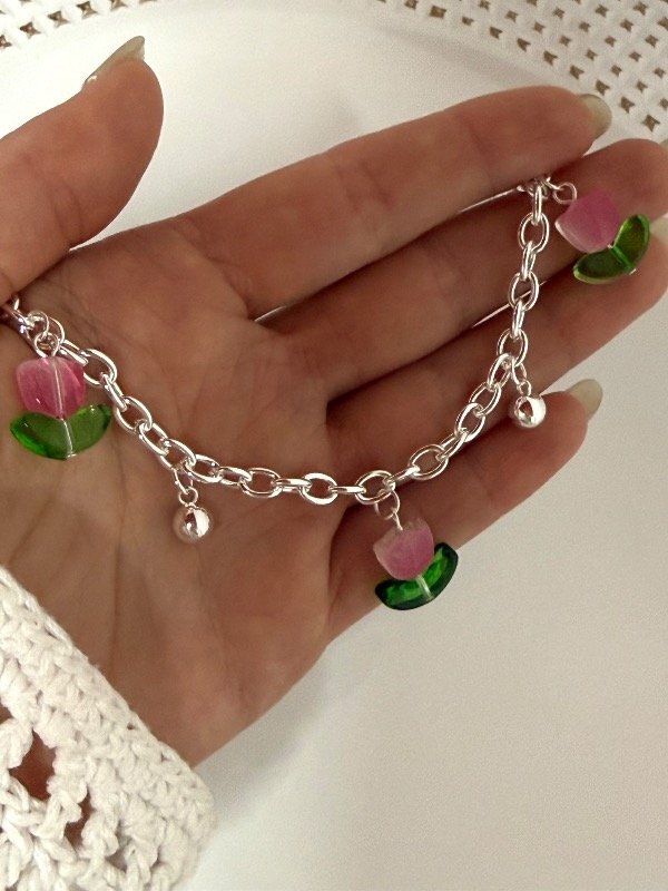 PB1238 Pulsera flores y bolitas 18 + 5 cm acero blanco