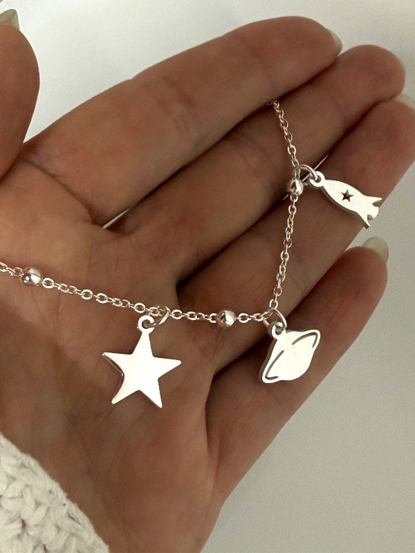 PB1255 Pulsera/tobillera planeta y estrellas 19 + 5 cm acero blanco
