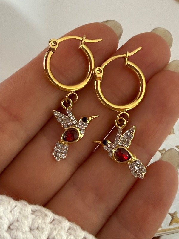 AD439 Aros colibrí strass y cubik rojo acero dorado