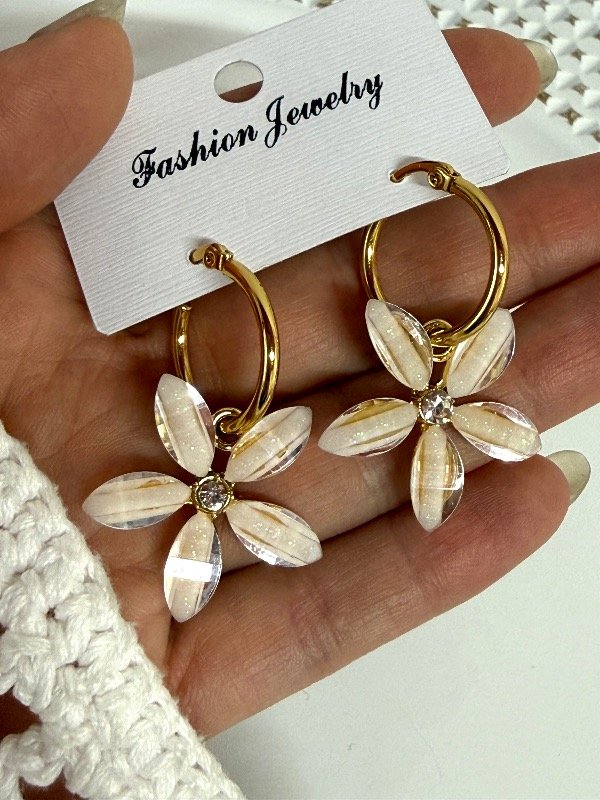 AD450 Aros argolla maxi flor blanca acero dorado