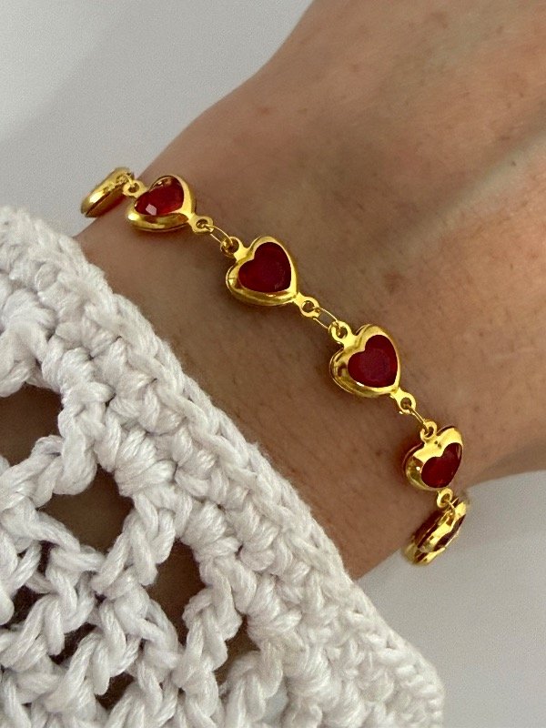 PD185 Pulsera corazones cubik rojo 18 cm acero dorado