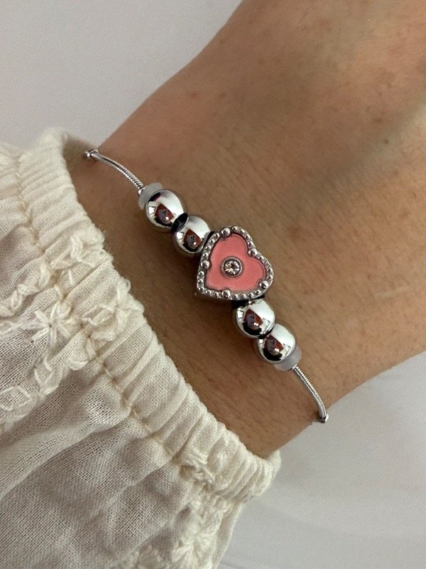 P762 Pulsera corazón rosa con bolitas 19 cm