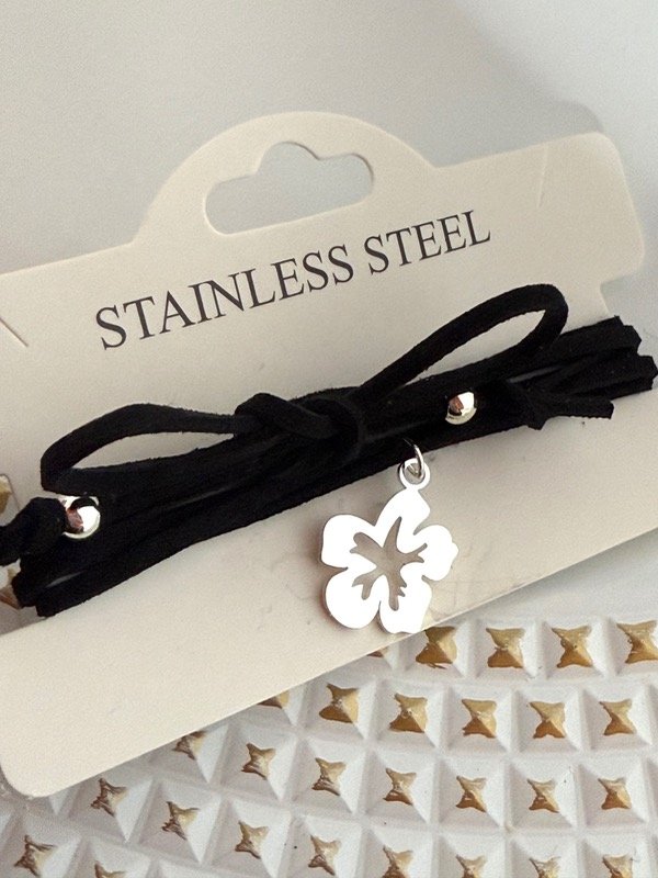 CB440 Collar cordón gamuzado largo con dije flor acero blanco