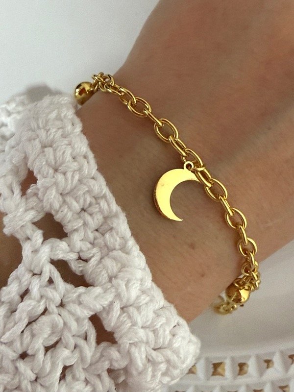 PD129 Pulsera multidijes lunitas y bolitas acero dorado 18 cm