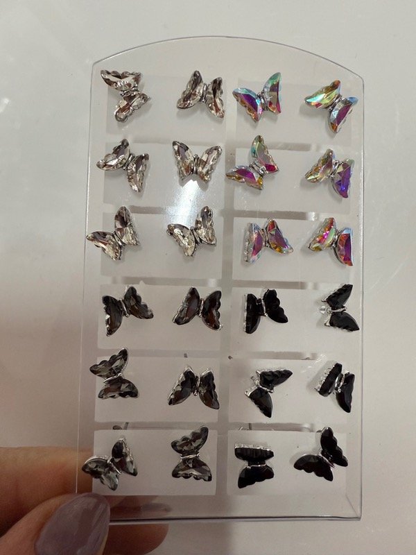 12 pares de aritos 4 colores ( cristal, tornasol, gris y negro)