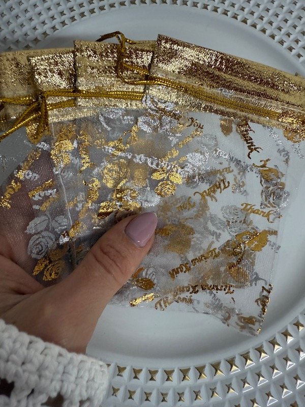 BO018 Bolsitas de organza estampadas 12 x 9 cm pack por 5 unidades